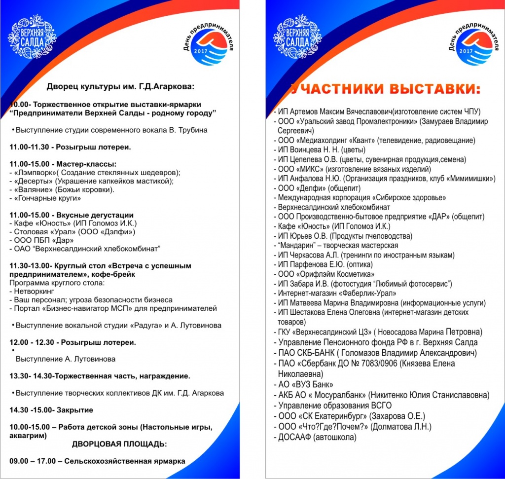 11 ноября в ДК им. Г.Д. Агаркова проводится выставка-ярмарка «Предприниматели Верхней Салды – родному городу» посвященная Дню предпринимателя – 2017.
