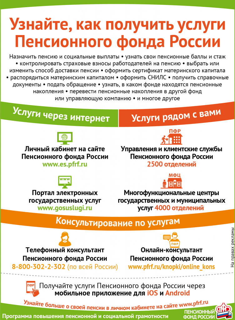 Все услуги и сервисы, предоставляемые ПФР в электронном виде, объединены в единый портал на сайте Пенсионного фонда Российской Федерации по адресу https://es.pfrf.ru. Для большего удобства портал структурирован не только по типу получаемых услуг (пенсии и социальные выплаты, материнский капитал, формирование пенсионных прав), но и по доступу к ним – с регистрацией или без регистрации. Для доступа к услугам, имеющим отношение к персональным данным, необходимо иметь подтвержденную учетную запись на едином портале госуслуг (www.gosuslugi.ru) или пройти регистрацию в единой системе идентификации и аутентификации (ЕСИА).